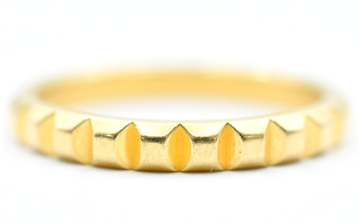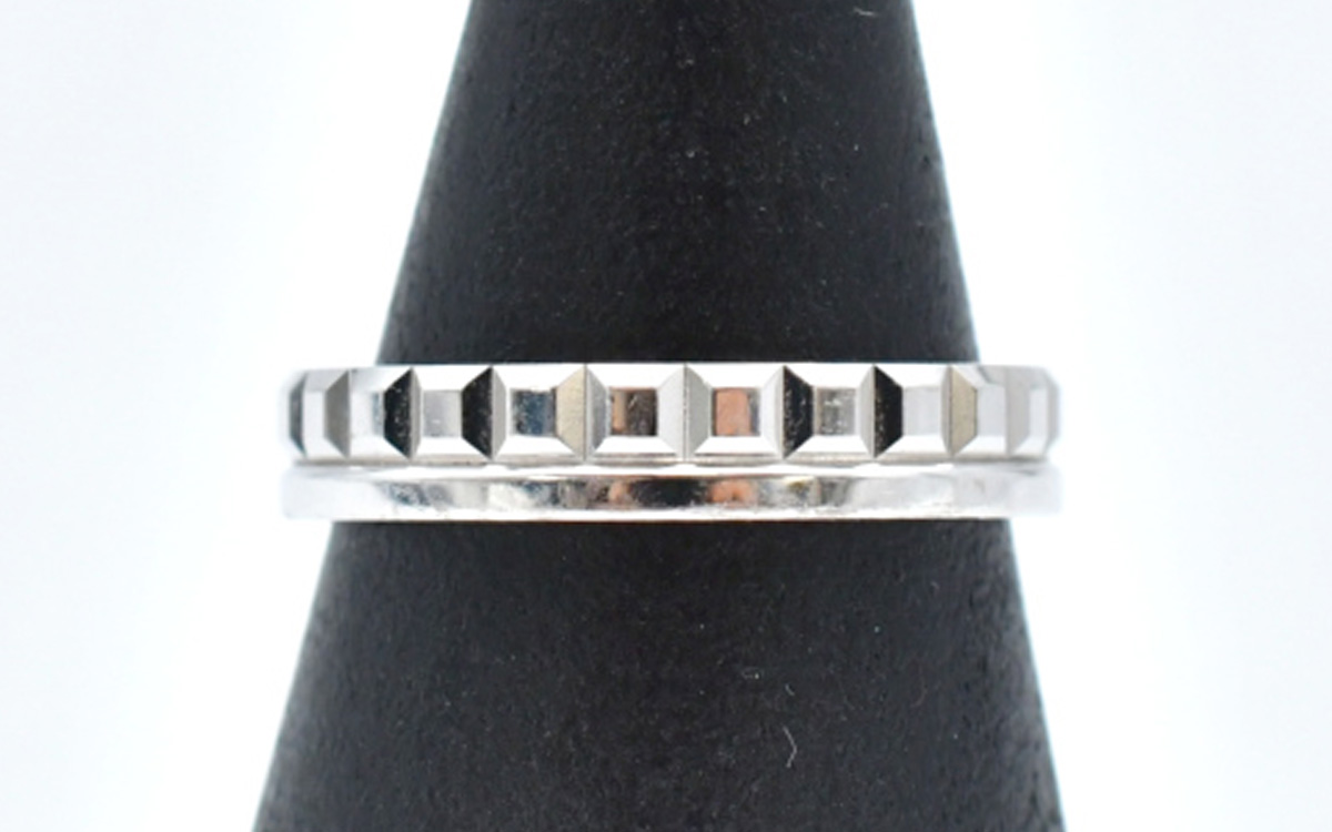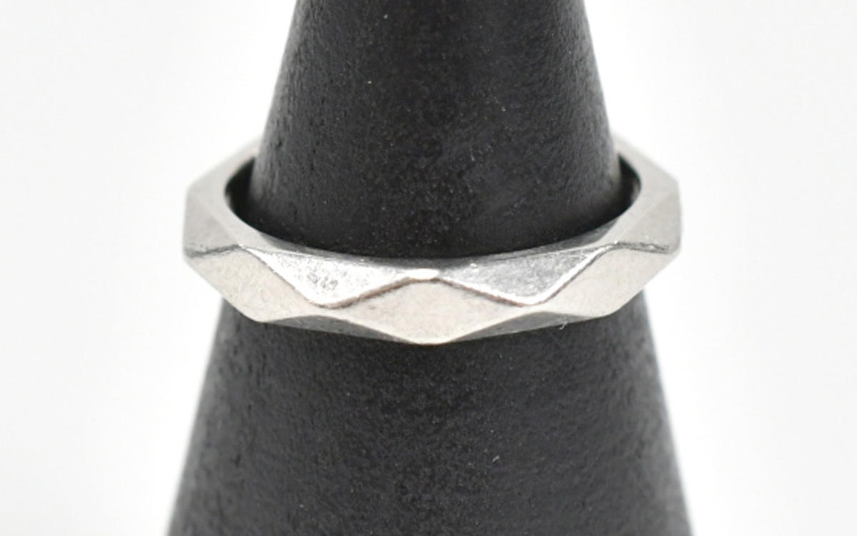 緻密に研磨された面が光を繊細に反射し、指輪そのものが宝石のような輝きを放つのが特徴です。モダンで幾何学的なデザインは指先をすっきりと見せ、シンプルながらも存在感があります。