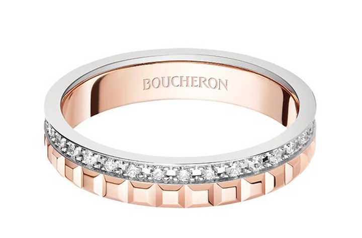 「キャトル クラシック リング ハーフ」は、ブシュロンの代表的なモチーフである“ゴドロン”と“クル ド パリ”を融合させた、18KYGと18KPGのコンビネーションリングです。