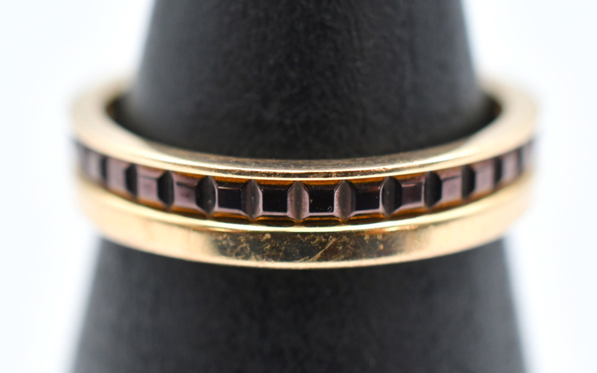 2つの指輪を並べたときのコントラストが美しく、シンプルながらもひとくせあるクラシカルなデザインです。