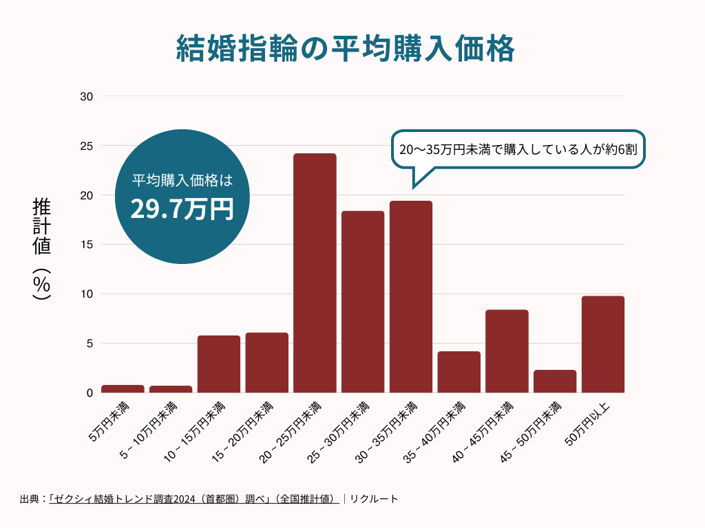 「ゼクシィ結婚トレンド調査2024(首都圏)調べ」(全国推計値)によると、結婚指輪(ペア)の平均購入金額は29万7000円です。