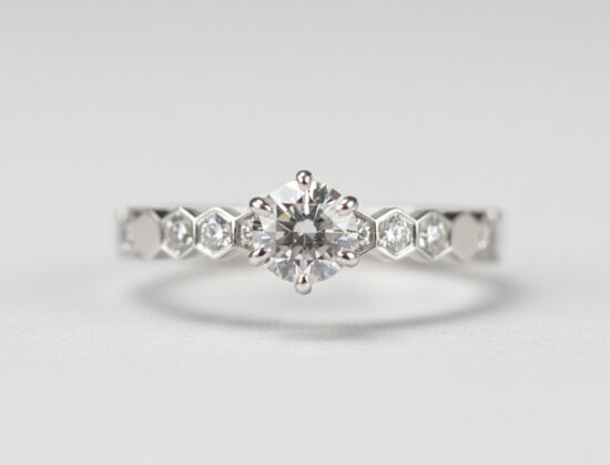 18Kのホワイトゴールド(18KWG)・幅4mmリングで、六角形のパターンが連なり、モダンで洗練された輝きを放ちます。内側にはシークレットダイヤモンドが一粒あしらわれ、上品な遊び心を感じさせます。造形美と個性が調和した指輪で、高いデザイン性を求める方におすすめです。