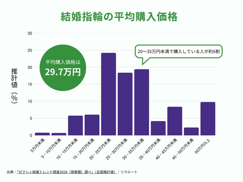 「ゼクシィ結婚トレンド調査2024(首都圏)調べ」によると、結婚指輪の全国平均購入額は2人分で約29万7000円。約6割のカップルが20万円〜35万円未満で購入しています。