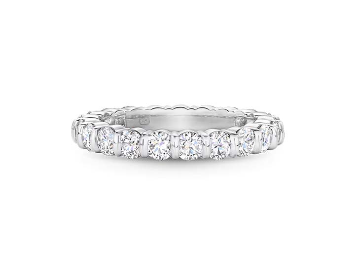 プラチナのバンドにラウンドブリリアントカットダイヤモンドをバーセッティングした、エタニティタイプの結婚指輪です。