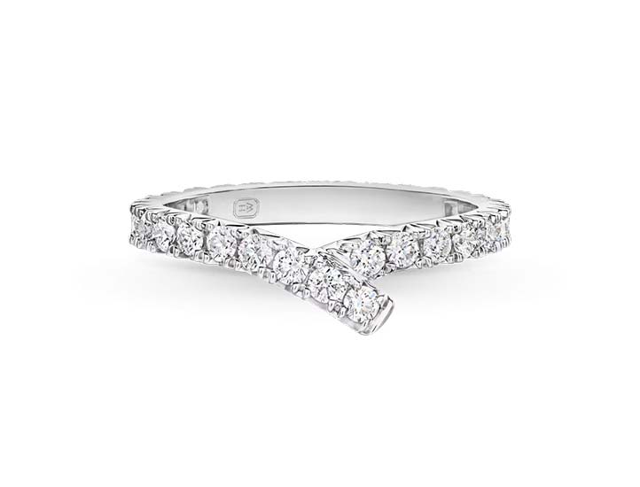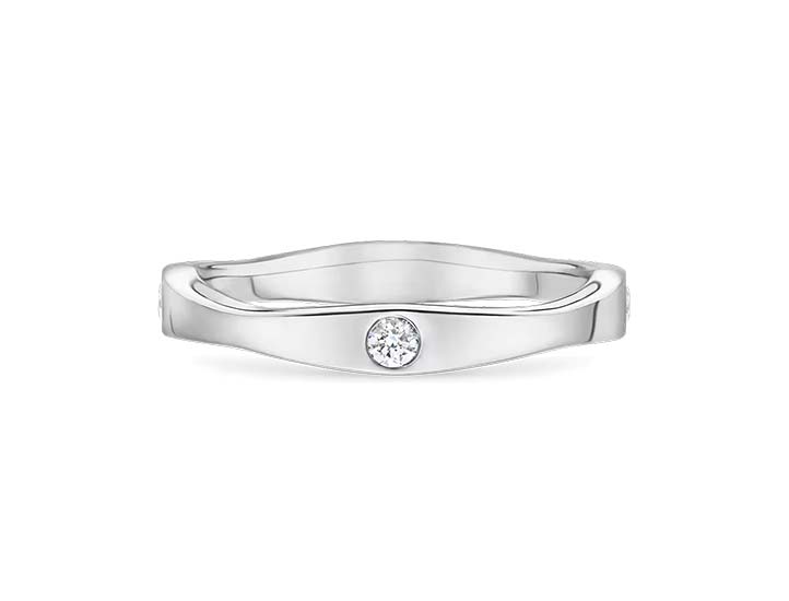 山を描いたようなくぼみのあるデザインが特徴的で、婚約指輪のセンターストーンと合わせるようにして重ねづけも楽しめます。54石のラウンドブリリアントカットダイヤモンド(計約0.23カラット)がプラチナバンドにセッティングされ、指元にエレガントな煌めきを添えます。