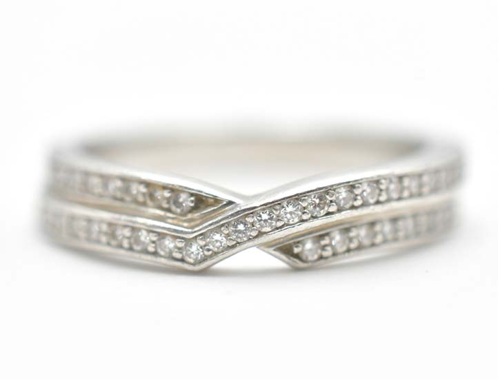 2列に連なる繊細なダイヤモンドのラインが交差する、モダンで流麗なデザインの結婚指輪です。