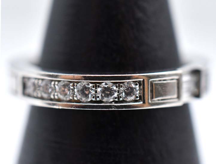 プラチナのバンドに、29石のラウンドブリリアントカットダイヤモンド(計約0.12カラット)を1列に敷き詰めたパヴェタイプの結婚指輪です。