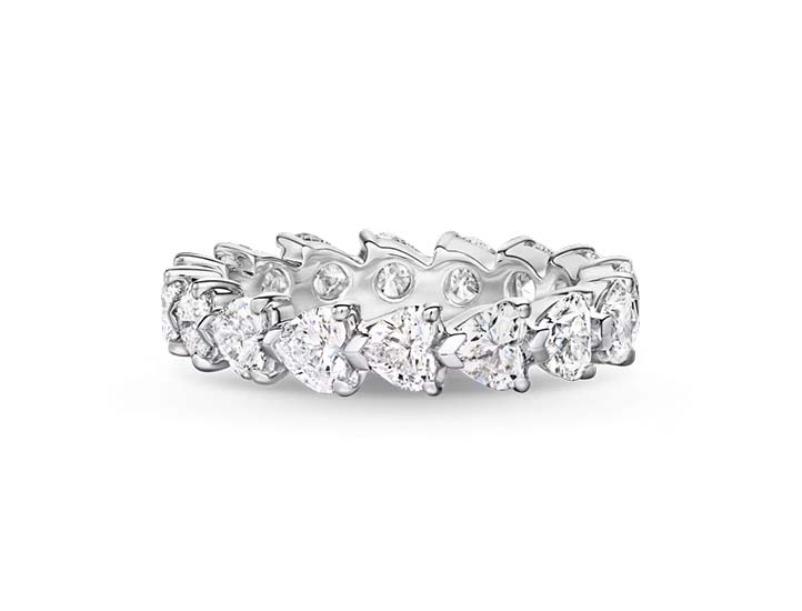 希少なハートシェイプカットのダイヤモンドをプラチナのバンドに爪留めで連ねた、贅沢なフルエタニティタイプの結婚指輪です。愛と誓いを永遠に象徴するにふさわしいデザインで、気品ある佇まいと圧倒的な存在感が指元に洗練を与えます。