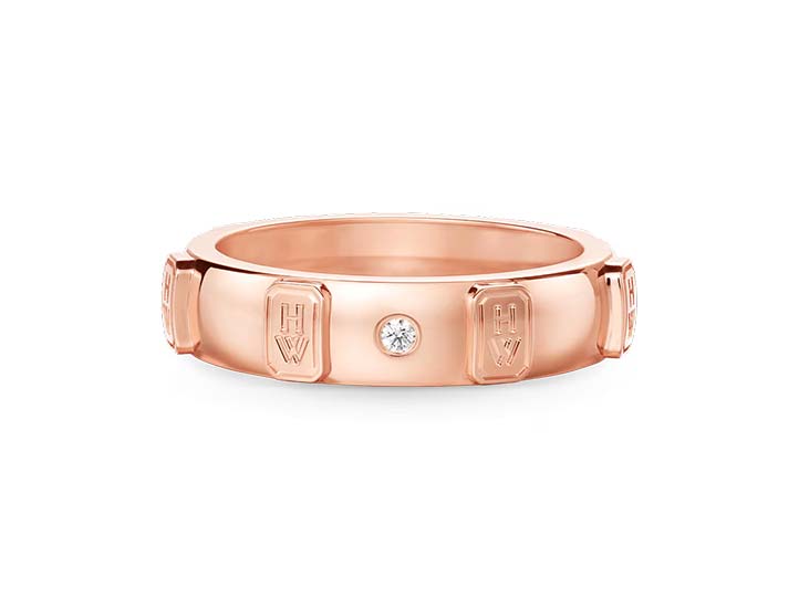 ハリー・ウィンストンの頭文字「H」と「W」をモチーフにした、ブランドの象徴的なバンドリングです。約0.01カラットのラウンドブリリアントカットダイヤモンドを1石あしらい、ブランドらしい上品さを引き立てています。