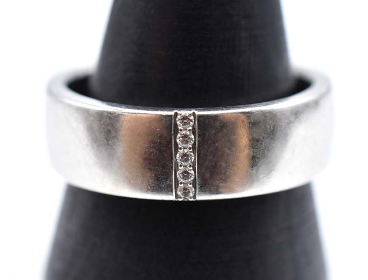 プラチナのバンドに、計約0.04カラットのラウンドブリリアントカットダイヤモンド5石を等間隔にあしらった結婚指輪です。