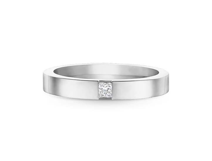 プラチナのバンドに、約0.10カラットのプリンセスカットダイヤモンドを1石あしらった結婚指輪です。