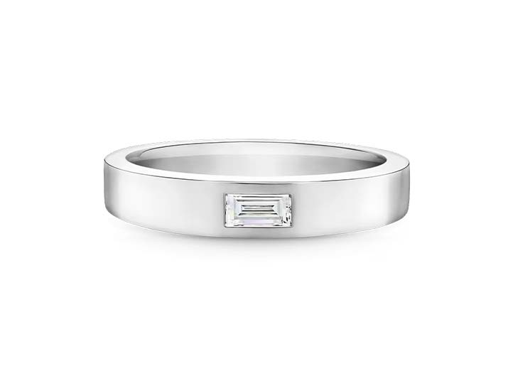 約0.21カラットのバゲットカットダイヤモンドを1石、プラチナのバンドにあしらったシンプルで洗練されたデザインの結婚指輪です。
