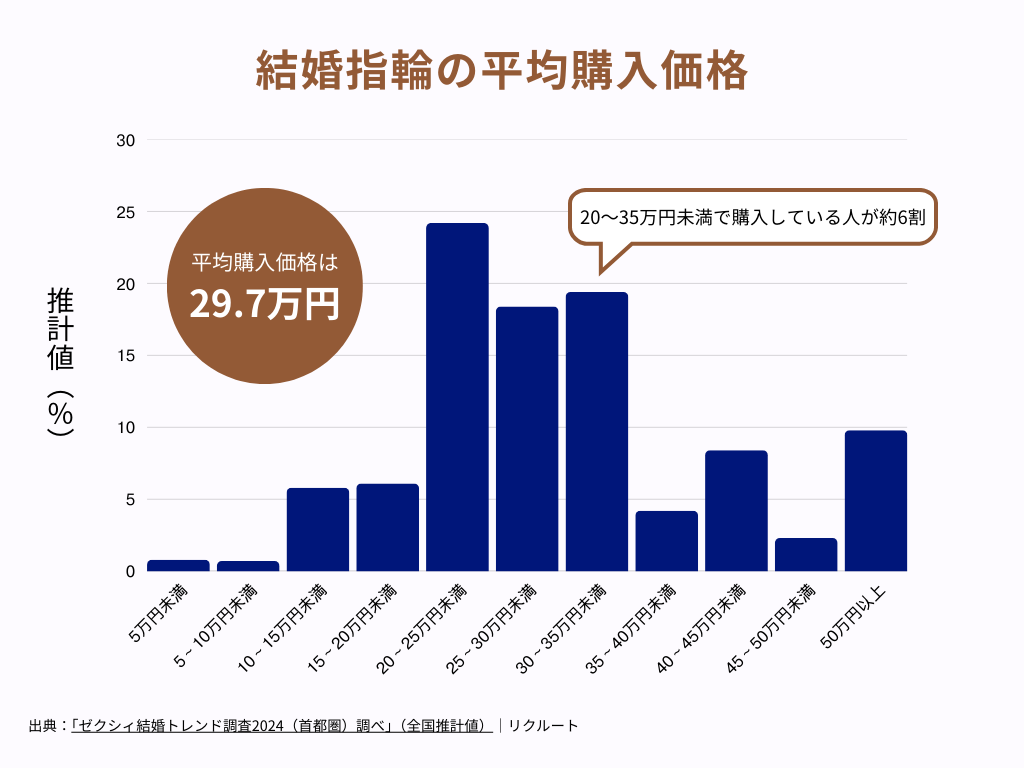 「ゼクシィ結婚トレンド調査2024(首都圏)調べ」(全国推計値)によると、結婚指輪(ペア)の平均購入金額は29万7000円です。