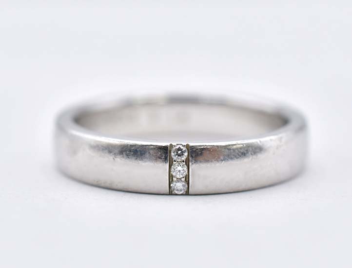 プラチナのバンドに、3石のラウンドブリリアントカットダイヤモンド(計約0.02カラット)をあしらった結婚指輪です。