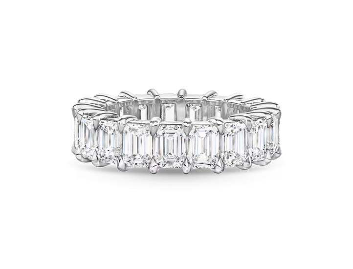 シックで気品ある輝きは、エメラルドカットならではのタイムレスな魅力を放ちます。1周にわたりエメラルドカットダイヤモンド(計約8.89カラット)が並び、指元に圧倒的な存在感を与えるのも特徴です。