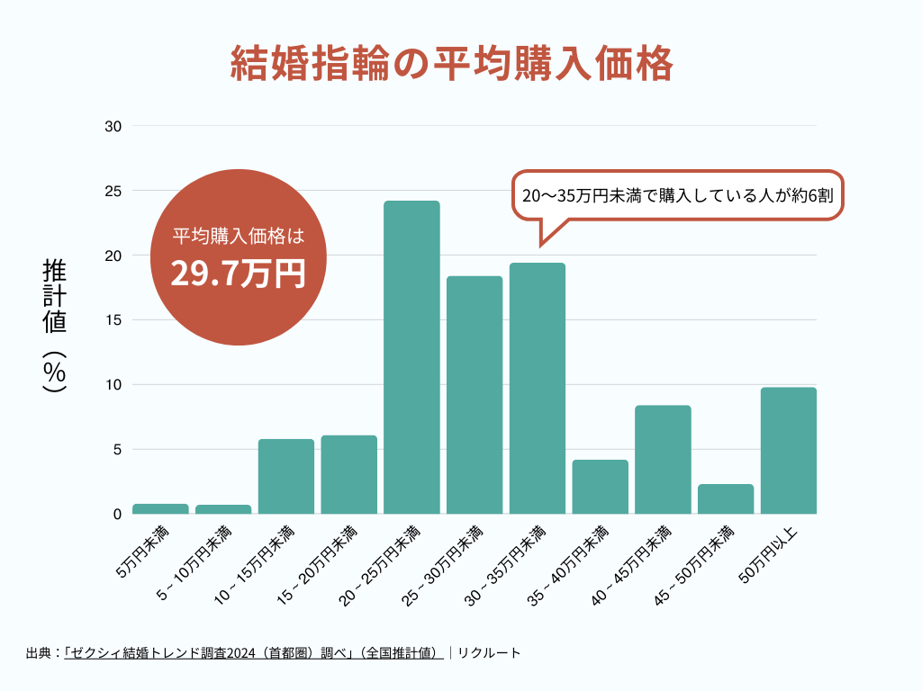 「ゼクシィ結婚トレンド調査2024(首都圏)調べ」(全国推計値)によると、結婚指輪(ペア)の平均購入額は29万7000円。20万~35万円未満で購入するカップルが、全体の約6割を占めています。