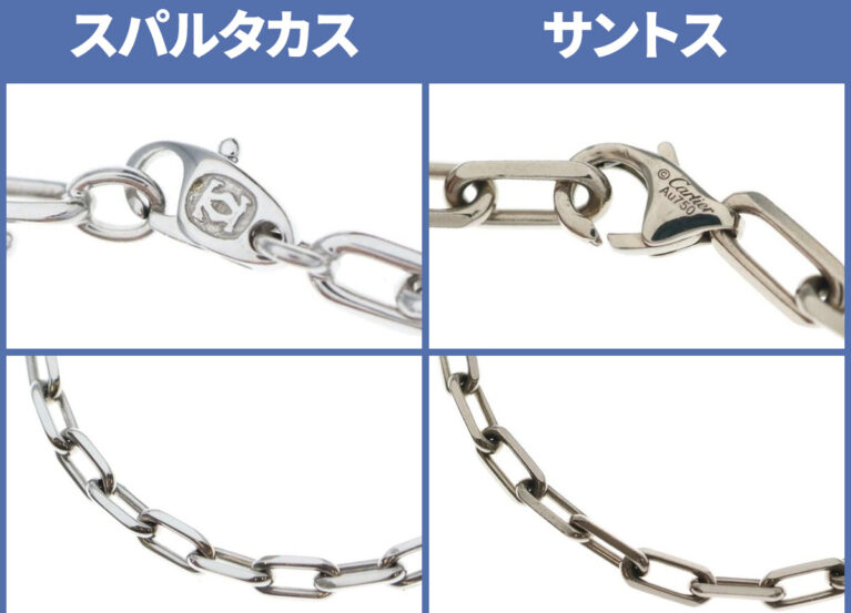 「Cartier(カルティエ)」のジュエリーであるSpartacus(スパルタカス)とSantos de Cartier(サントス ドゥ カルティエ/以下、サントス)。どちらもチェーンタイプのジュ…