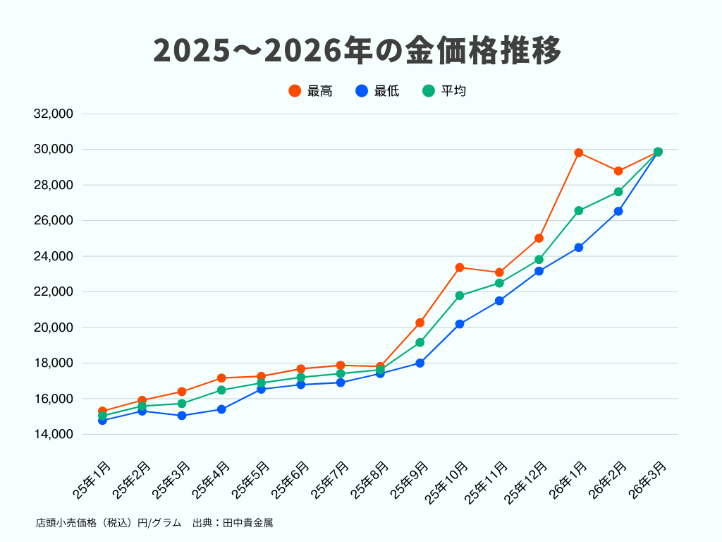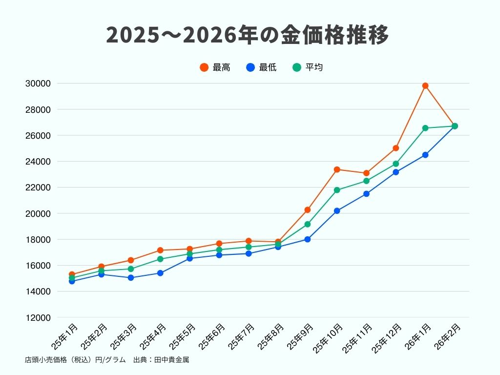 2024年〜2025年にかけて金価格は高値圏で推移し、2025年9月には国内の店頭小売価格が初めて2万円台に到達しました。さらに、2026年2月時点でも国内の金価格は歴史的に見ても高い水準を維持しています。