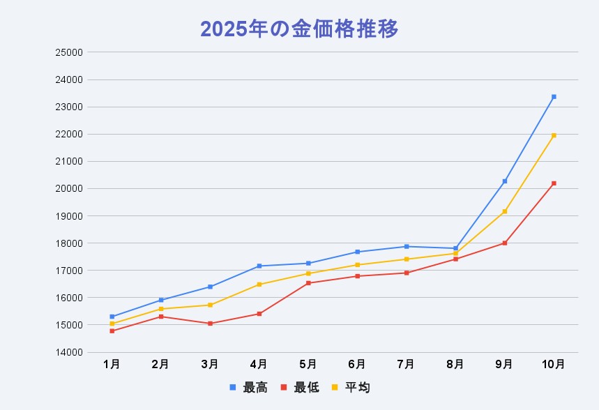 2024年には国際市場で過去最高値を更新し、2025年もその勢いを保ったまま高値圏で推移しています。日本国内でも金価格は1グラム2万円を超え、史上最高水準に到達しました。