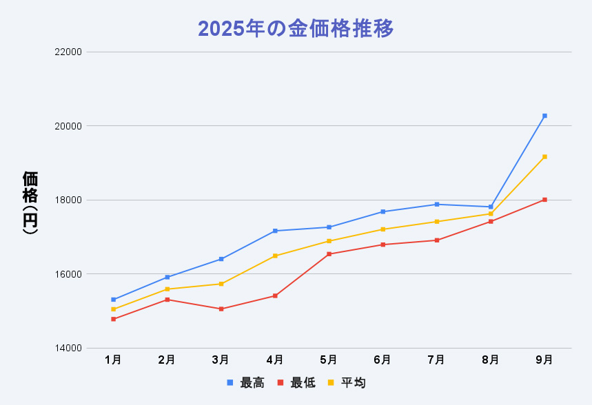 金価格は2025年9月30日に1グラムあたり2万268円を記録し、はじめての2万円台を突破しました。