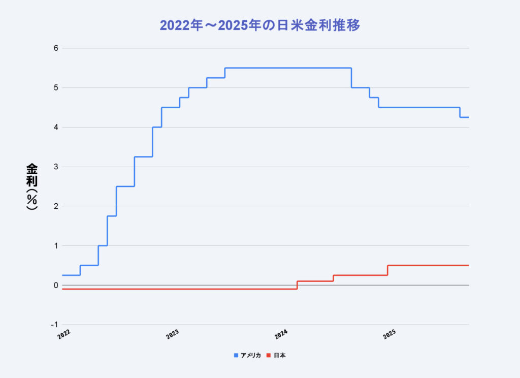 2024年からはアメリカでは利下げ傾向、日本では利上げ傾向となり、金利差が縮小しているものの、円安の大幅な改善にはいたっていません。それどころか、2025年にはトランプ大統領が対日25%関税を表明したことで円安が加速しています。