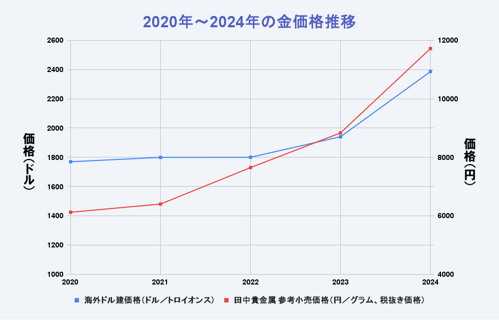 2020年のコロナ禍の金価格は1グラムあたり約6000円前後で推移していましたが、2022年頃から徐々に上昇傾向となり、2024年に大きく上昇しました。コロナ禍の水準と比較して3倍以上の成長を遂げています。