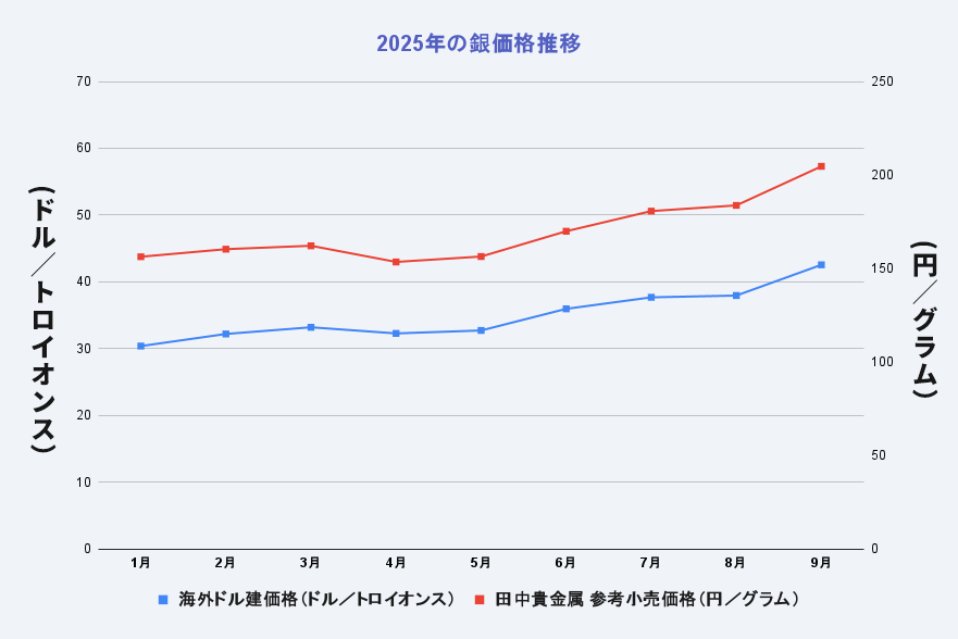 国際相場で2024年は、1トロイオンスあたり年平均28.27ドルだったものが、2025年10月現在、1トロイオンスあたり平均46.95ドルに達しています。国内指標も同様で、銀価格は2024年の1グラムあたり年平均141.42円から、2025年10月現在、1グラムあたり平均240円台へ上昇しています。