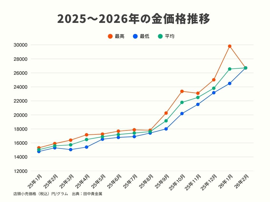 しかし、アメリカのトランプ大統領がFRB次期議長にケビン・ウォーシュ氏を指名すると発表したことや、短期取引による利益確定売りが相次いだことをきっかけに、30日のNY市場では金価格が高値圏から急落し、大幅な調整局面となりました。週明けとなる2月2日の国内金価格も1グラムあたり2万6,000円台まで下落し、短期間で大きな調整を見せたといえます。