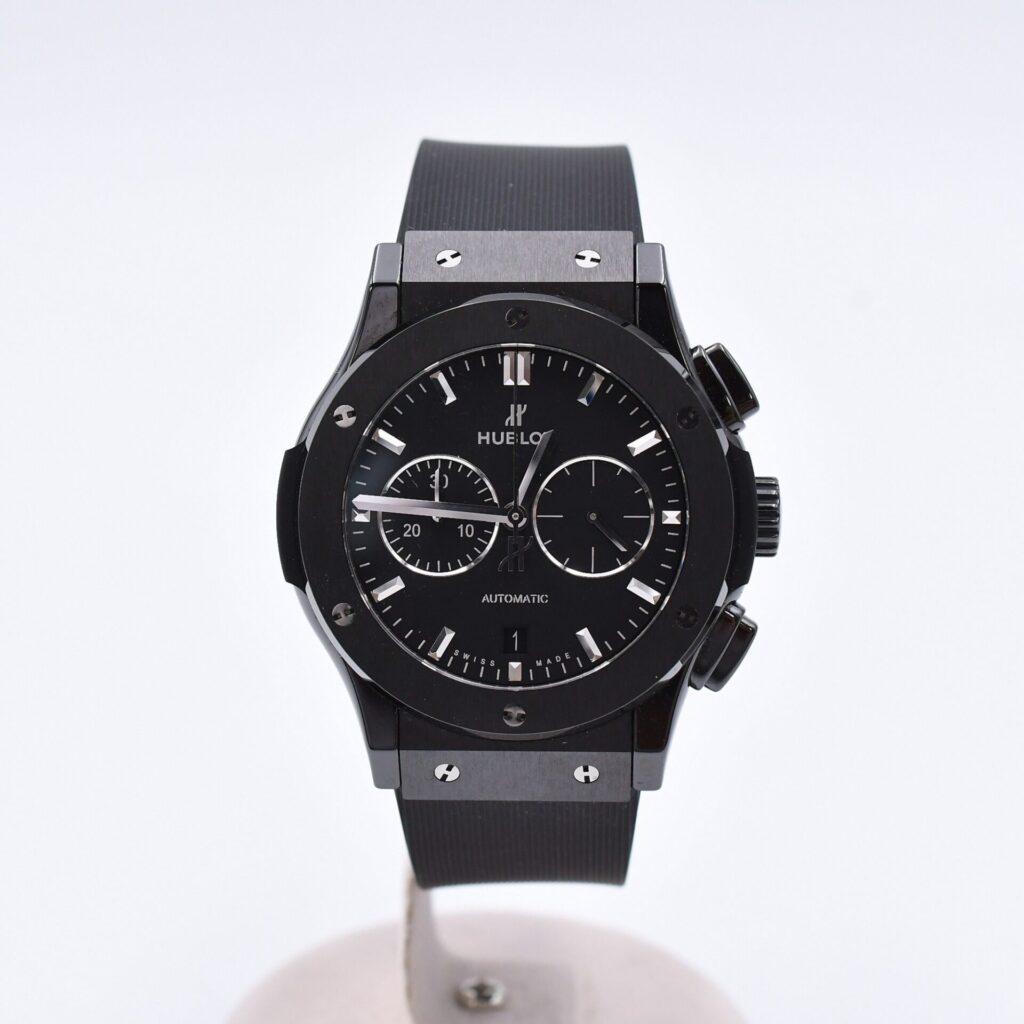 シンプルで洗練されたクラシック・フュージョンの中でも、ブラックセラミックを採用した「ブラックマジック」は軽さと耐傷性を兼ね備えた人気モデルです。クロノグラフながら厚みを抑えた設計で、オン・オフ問わず着用しやすい点が魅力。ブラックで統一されたデザインは上品で存在感があり、ウブロ初心者から愛好家まで幅広く支持されています。
