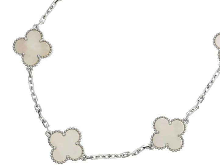 アルハンブラの最大の特徴は四つ葉のクローバーのモチーフです。4枚の葉はバランスがとれた形になっています。そして、クローバーの縁には細かい粒が連なっており、真贋を見極めるポイントです。