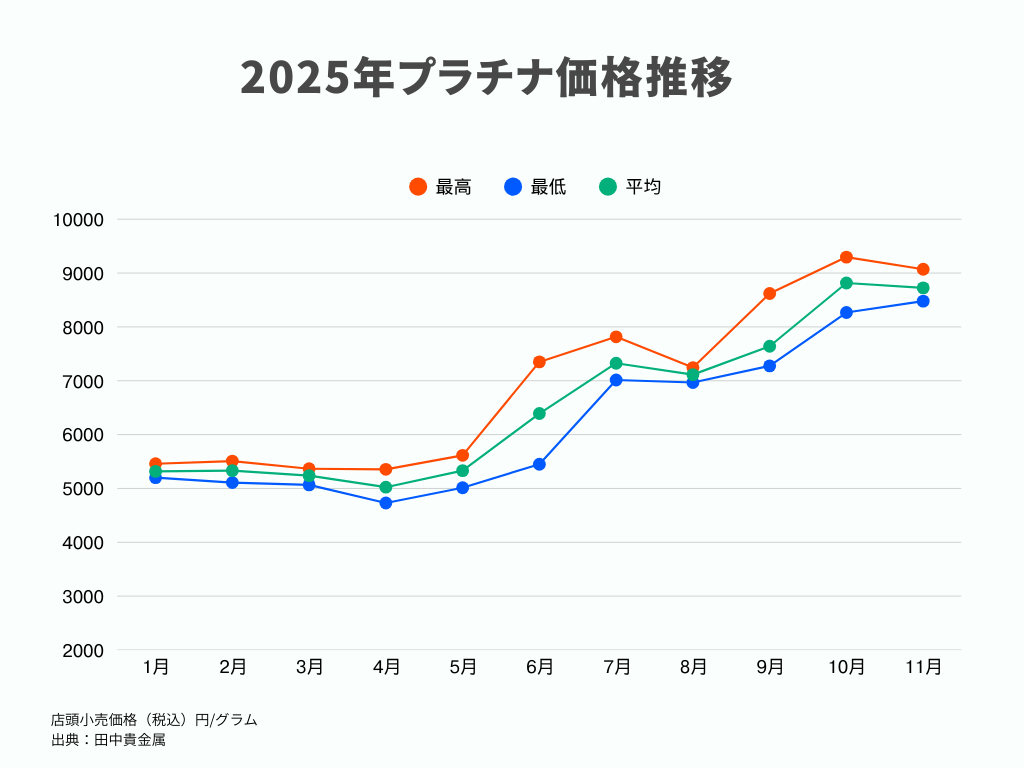 2025年10月以降のプラチナ相場は、8,200円〜9,100円台を中心に推移しており、8,000円台後半を軸とした底堅い値動きが続いていました。