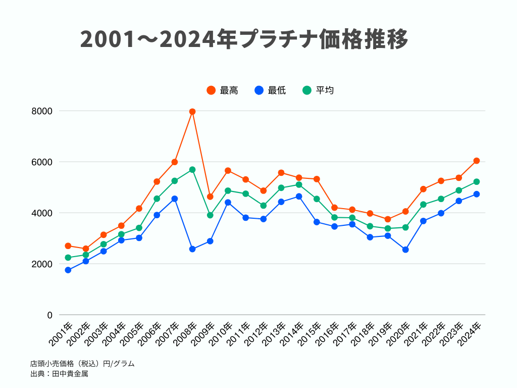 2023年はプラチナ価格が安定的に回復し、2024年には本格的な上昇トレンドに入りました。田中貴金属の店頭小売価格(1gあたり)で見ると、2023年の安値は4,400円台、2024年の高値は6,000円台前後まで上昇しており、投資家の注目を集める展開となりました。