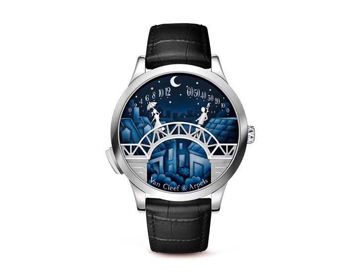 恋人たちの逢瀬がモチーフとなっている「ミッドナイト ポン デ ザムルー ウォッチ」。月明りの下、パリの橋の上で待ち合わせする2人を表現した、ロマンチックなデザインとなっています。