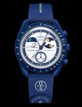 2025年10月に「Bioceramic MoonSwatch」から、満月をテーマにした最新作「MISSION TO EARTHPHASE – MOONSHINE GOLD」が登場。スウォッチの最新技術「アースフェイズ」や、オメガの“Moonshine™ Gold”を組み合わせたムーンフェイズ表示を搭載。そこにスヌーピーの世界観を反映したイラストが加わっています。