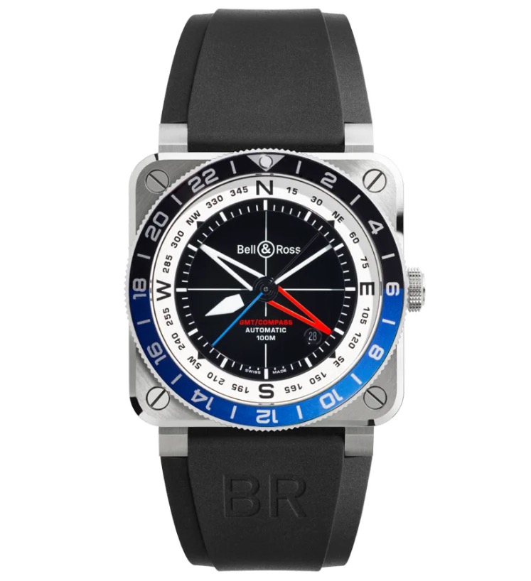 航空計器をモチーフにした独自のデザインで知られる「BELL & ROSS(ベルアンドロス)」。BR-03 GMT COMPASSは、ブランドの象徴的なスクエアケースにGMT機能を組み合わせた存在感抜群のモデルです。